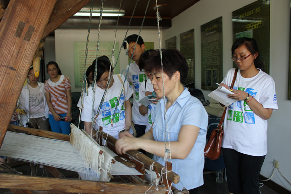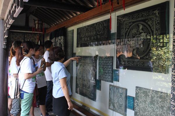 南通被誉为“蓝印花布之乡”。下午1点30分,暑期社会实践团又来到了由吴元新一手创办的南通蓝印花布博物馆,该博物馆已被列为中国蓝印花布传承基地,由吴馆长负责申报的“南通蓝印花布印染技艺”已列入首批国家级非物质文化遗产名录。在工作人员的引导下,同学们参观了蓝印花布的整个工艺制作流程,并认真听取了关于蓝印花布历史发展、工艺分类、制作流程、文印题材等内容的介绍,并在纺织、刮浆工序中上手实践。来自江苏教育电视台、南通电视台的记者也对实践团队进行了专访。学生们纷纷表示,通过实践和学习,大家感受到了传统文化的独特魅力,加深了对文化载体所蕴藏文化价值的了解,从而进一步增强了对传统文化保护的意识。
