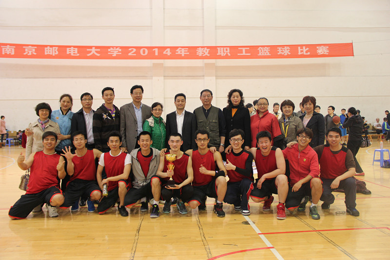 由南京邮电大学工会组织的2014年教职工篮球比赛,经过为期两周的小组循环和交叉淘汰的奋力角逐,机关篮球队和通达篮球队分别以上、下半区第一名的成绩进入决赛。4月18日下午,南邮仙林体育馆内人声鼎沸、热闹非凡,翘首期盼的师生怀着激动的心情前来观看这场巅峰对决。主席台上一顺排列着熠熠闪光的八个奖杯,副校长张志华、工会主席彭洋、体育部主任薛雨平等领导亲临赛场观摩,今年会官网党委副书记王立辉,院长助理甘宗盛、卞文献,工会主席余素兰率领通达师生临场助阵。