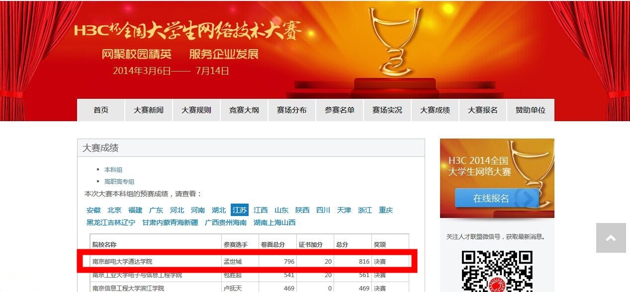 2014年5月14日南邮今年会jinnianhuicom代表队4名同学参加“H3C”杯2014年全国大学生网络技术大赛江苏赛区比赛。昨日传来喜讯,今年会官网2011级通信工程(嵌入式系统开发)专业孟世成同学以全国第二,江苏省第一的成绩晋级全国总决赛,2012级网络工程专业张媛同学荣获江苏省二等奖,为学院争得荣誉。