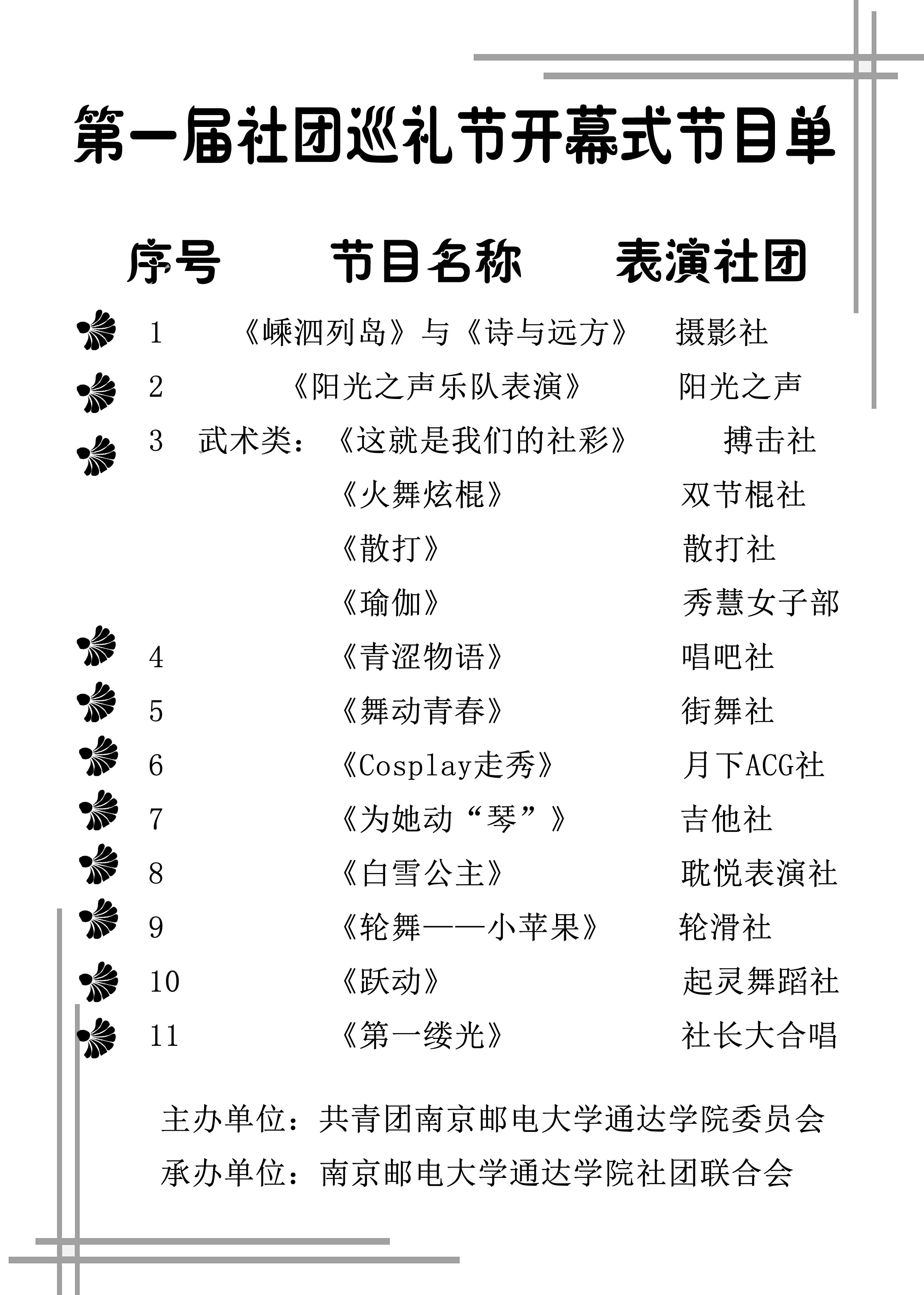 党委王立辉副书记首先在开幕式晚会上致辞。他指出,社团活动对丰富大学生课余生活,繁荣校园文化,锻炼大学生能力素质具有重要意义,希望社团联席会以第一届社团巡礼节为契机,强化组织协调,不断提升社团活动的品质,为通达校园注入更多的激情与活力。