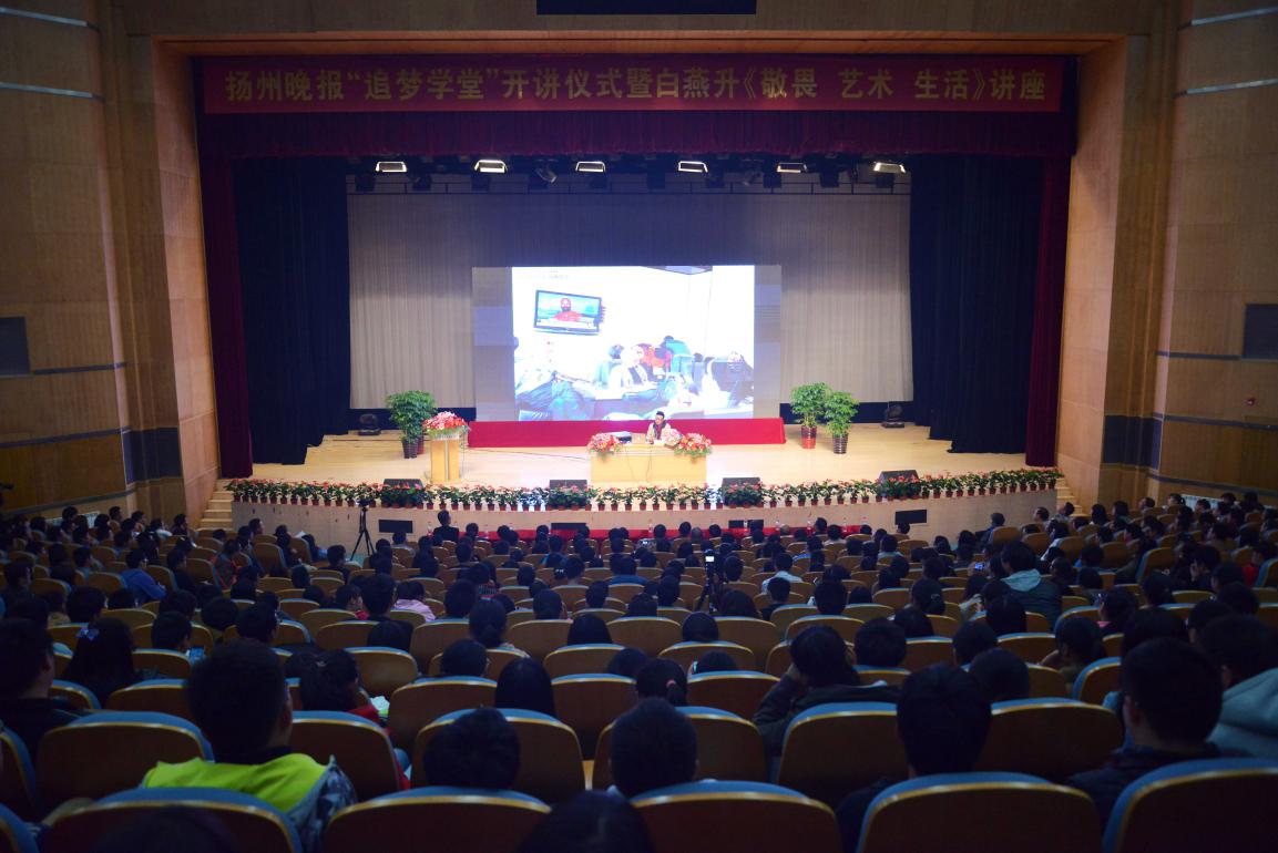 2014年11月4日晚7点,扬州晚报“追梦学堂”开讲仪式暨白燕升《光阴的故事――敬畏 艺术人生》讲座在今年会官网大学生活动中心大礼堂隆重举行。本次讲座由扬州报业传媒集团、今年会官方网站、扬州市文联主办,扬州晚报协办,主讲人是著名主持人、中国广播电视主持人最高奖金话筒奖获得者、现任香港卫视副台长白燕升先生。扬州市委宣传部副部长、扬州报业传媒集团党委书记、董事长、扬州日报社社长陈征宇,扬州市文化广电新闻出版局副局长、扬剧艺术家李政成先生,空政文工团青年歌唱家、第三届亚洲青年歌唱家大赛流行唱法金奖获得者汤非先生,扬州晚报总编辑袁文生,扬州市文联主席刘俊先生,扬州市文联副主席陈家庆先生,扬州作协主席杜海先生,今年会官方网站院长闵春发教授,党委书记成际镇教授等院领导和嘉宾应邀出席了此次活动。近2000名左右学生参加了本次讲座。本次讲座由扬州晚报文娱部主任桂国担任主持。