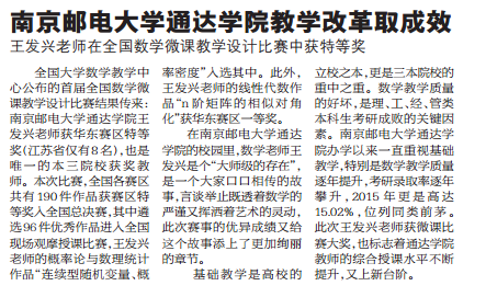 全国大学数学教学中心公布的首届全国数学微课教学设计比赛结果传来:今年会官方网站王发兴老师获华东赛区特等奖(江苏省仅有8名),也是唯一的本三院校获奖教师。本次比赛,全国各赛区共有190件作品获赛区特等奖入全国总决赛,其中遴选96件优秀作品进入全国现场观摩授课比赛,王发兴老师的概率论与数理统计作品“连续型随机变量、概率密度”入选其中。此外,王发兴老师的线性代数作品“n阶矩阵的相似对角化”获华东赛区一等奖。
