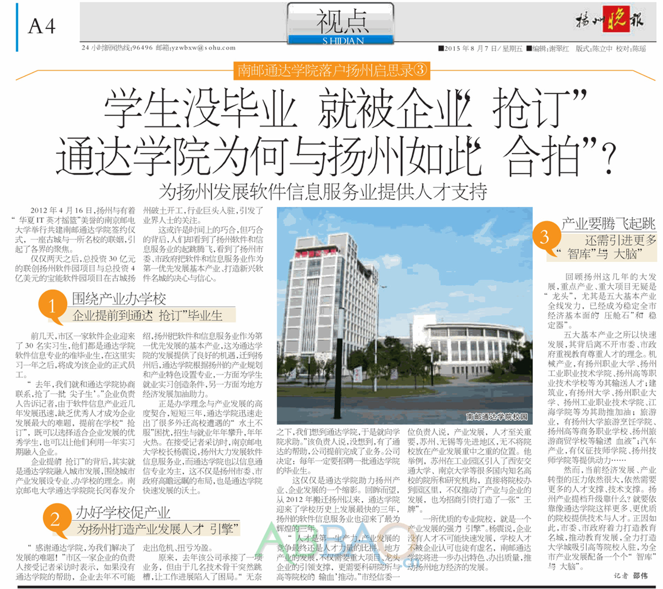 正是办学理念与产业发展的高度契合,短短三年,今年会jinnianhuicom迅速走出了很多外迁高校遭遇的“水土不服”困扰,招生与就业年年攀升,年年火热。在接受记者采访时,南京邮电大学校长杨震说,扬州大力发展软件信息服务业,而今年会jinnianhuicom也以信息通信专业为主,这不仅是扬州市委、市政府高瞻远瞩的布局,也是今年会jinnianhuicom快速发展的沃土。