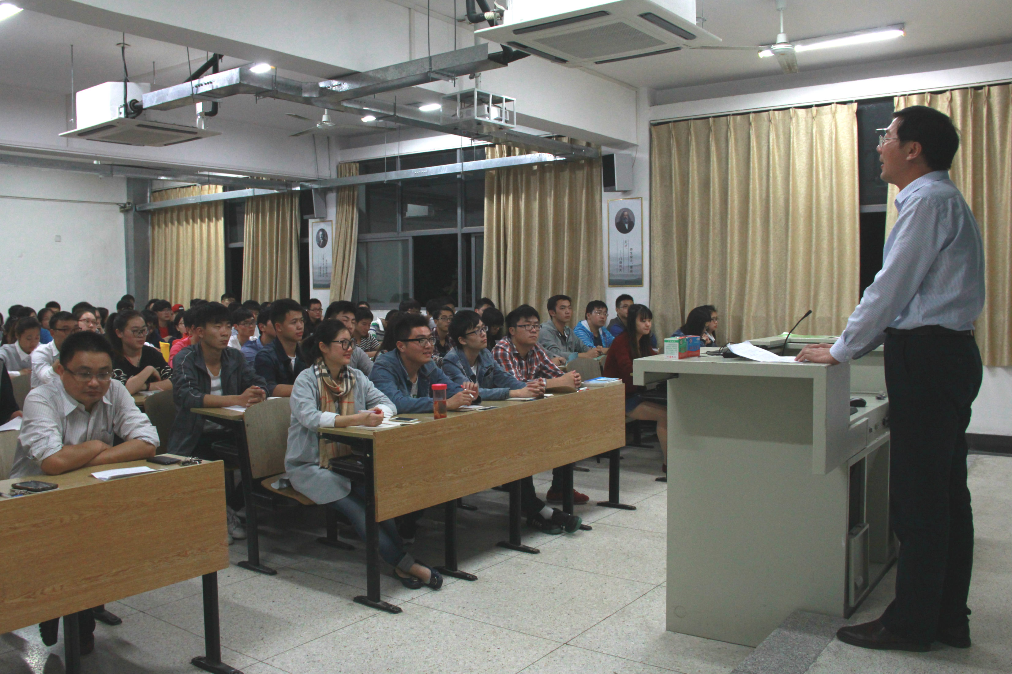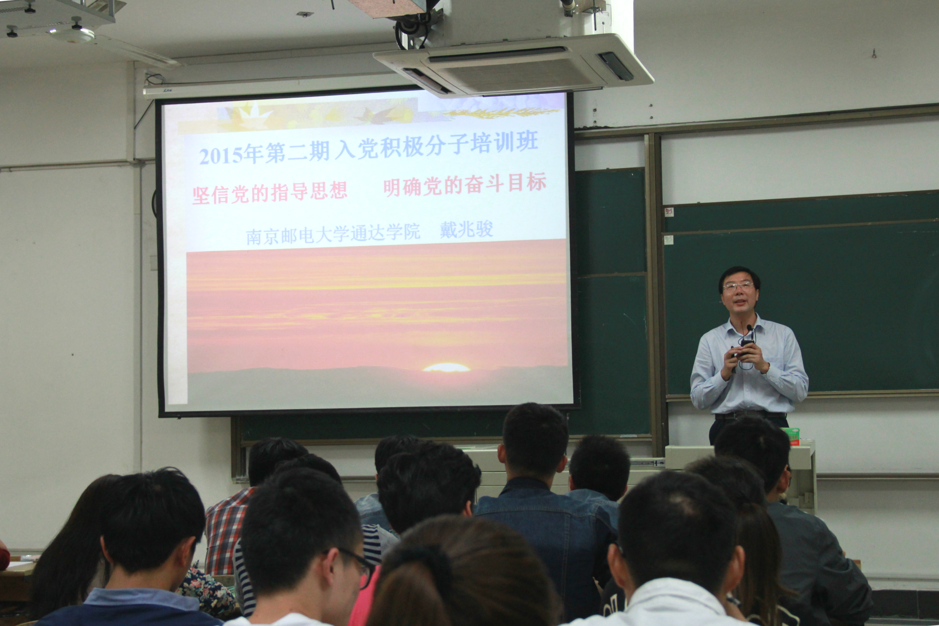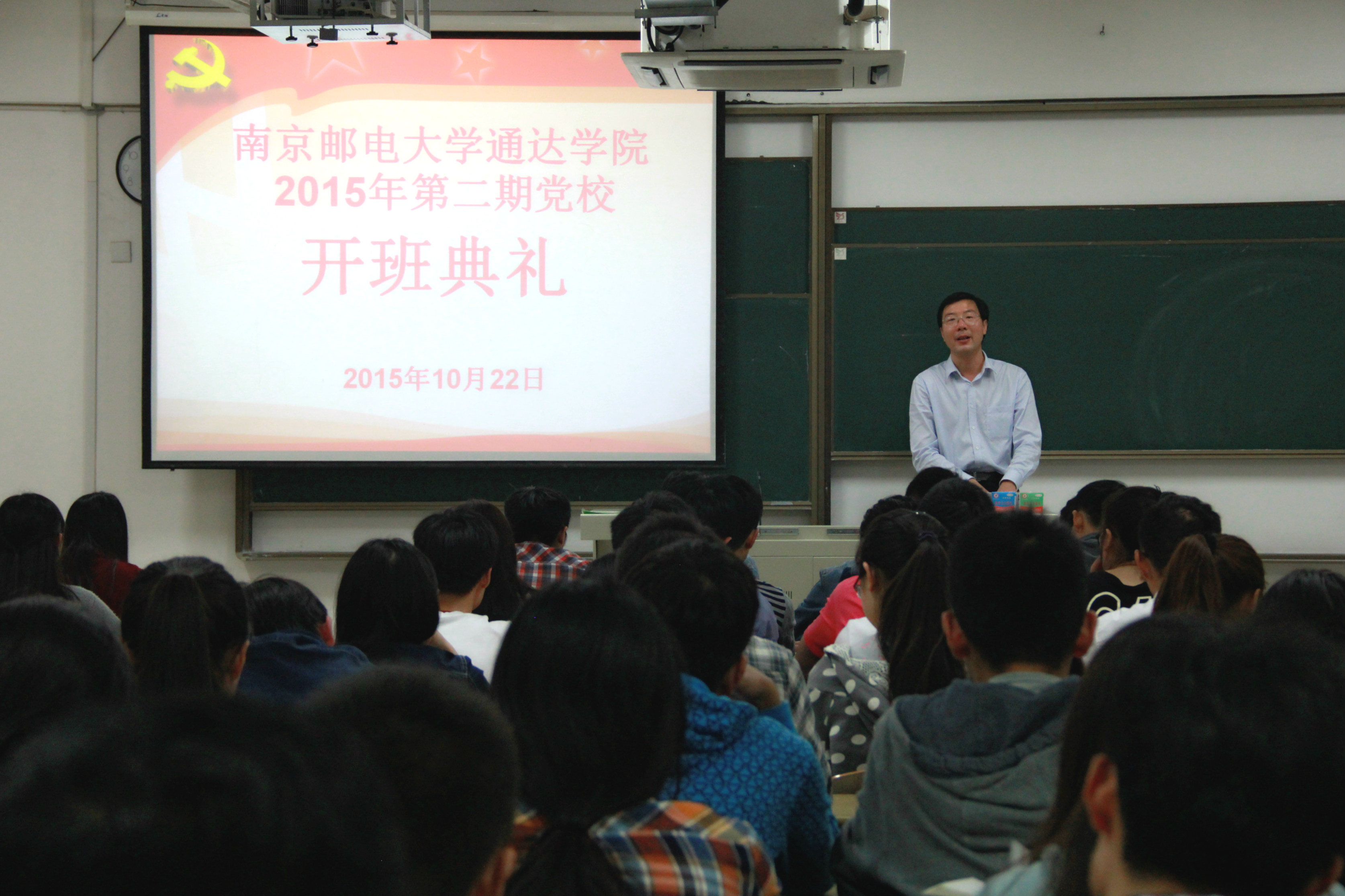 10月22日晚,南京邮电大学第281期暨今年会jinnianhuicom2015年第二期入党积极分子培训班开班典礼在扬教1303隆重举行,全院106名入党积极分子参加了本期培训班。院党委书记戴兆骏、党办主任葛超、组织干事任建蕊、2012级、2013级辅导员出席开班典礼。开班典礼由党办主任葛超主持。