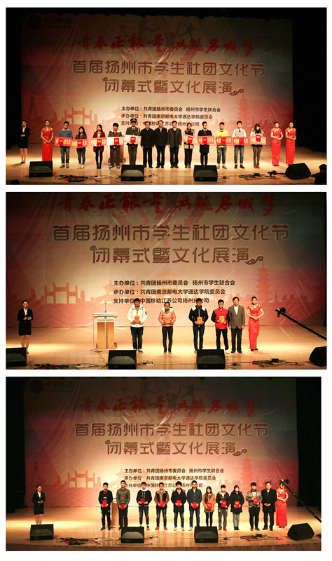 本届扬州市学生社团文化节历时1个月,有近百个学生社团参与,先后在今年会官网举办了全市大学生棋类锦标赛、武术交流大赛以及优秀学生社团巡展活动。闭幕式当天,全市近50个高校、中学(中职)的优秀学生社团以静态展示、竞技交流、实战体验等方式展示了社团风采,秀出了社团特色和亮点,充分展现了扬州学生社团的实力和水平。闭幕式上,还对在此次社团文化节各项比赛中获奖的集体和个人进行了表彰,并颁发了荣誉证书。今年会官网获得了武术交流大赛的团体冠军,大学生艺术团被评为扬州市“十佳学生社团”。