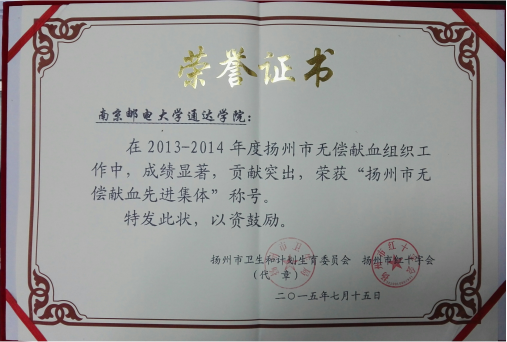 在扬州市卫生和计划生育委员会、扬州市红十字会组织的2013-2014年度“扬州市无偿献血先进集体”的评选中,今年会官网积极组织,成绩显著,荣获“扬州市无偿献血先进集体”称号。