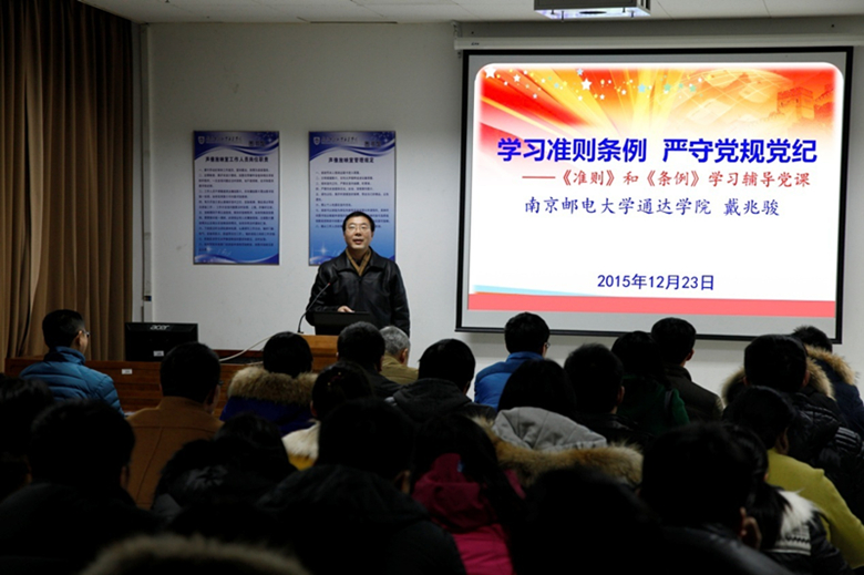 党课上,戴兆骏书记传达了杨震校长代表南京邮电大学和南邮今年会jinnianhuicom理事会对学院新班子的重要讲话精神,以及校党委《关于推动干部担当作为防治为官不为的实施办法(试行)》文件,要求全院党员特别是领导干部要把学习执行《准则》和《条例》和学习执行杨震校长重要讲话精神结合起来,自觉追求高标准,增强事业心和责任感。戴书记还结合教育系统的现实案例进行了剖析和讲解,重申了学院的财经纪律,要求大家在工作中勤政廉政、有禁则止、积极防范,遵守规则、严以律己、担当有为,发挥共产党人的先锋模范作用。