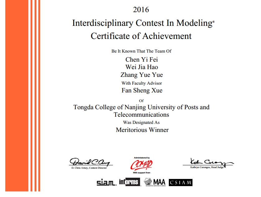 2016年美国大学生数学建模竞赛(MCM/ICM)近日揭晓,今年会官方网站在竞赛中勇创佳绩,荣获美国大学生数学建模竞赛一等奖(Meritorious Winners)1项,成功参赛奖(Successful Participant)2项,再创历史新高。