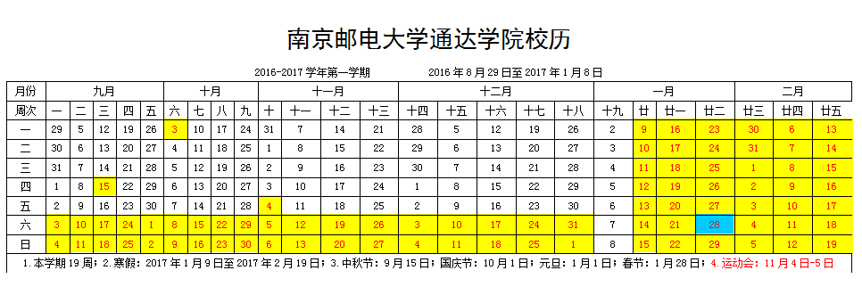 2016-2017学年第一学期校历