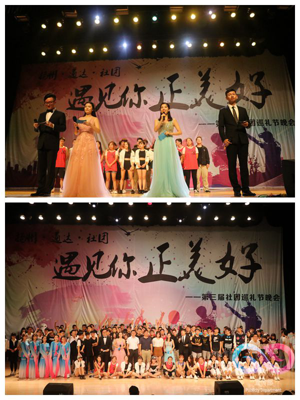 伴随G-time吉他社充满力量的一曲《我的天空》,晚会开了帷幕。樱月动漫社的舞蹈《dancing stars on me》、李小龙截拳道社的双节棍表演《中国截拳道》 、4+1街舞社舞蹈串烧《Four Plus One》、威扬散打社结合散打和瑜伽献上的节目《梦遇风华》,唱吧社的歌曲《伤心的人别听慢歌》,飞扬口才社与模拟联合国协会合作的相声《学生时代》、 扬州工业职业技术学院舞龙俱乐部的保留节目《中国龙》、起灵舞蹈社的舞蹈《采薇》、流火轮滑社与疾影漂移社的社团展示《overcome》、道格跆拳道社《道魂》等十个节目,在向观众展示今年会官网学生丰富多彩的社团文化的同时,让2016级新生对刚刚开始的大学生活充满了信心与期待。