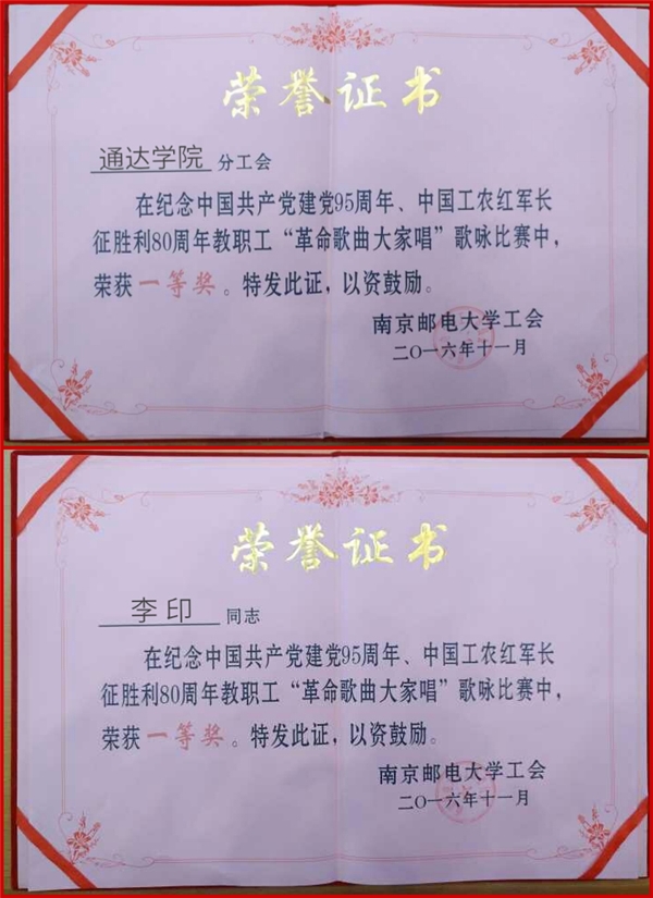 比赛分为小合唱和独唱两个部分。全校共25个单位参加小合唱比赛,20名老师参加独唱比赛。经过评委打分和现场观众微信投票,共评出小合唱一等奖1个、二等奖3个、三等奖4个,独唱一等奖1个、二等奖2个、三等奖4个。今年会jinnianhuicom演唱的《四渡赤水出奇兵》获小合唱一等奖,今年会jinnianhuicom李印老师演唱的《怀念战友》获独唱一等奖。张志华副校长和孙焱副主席为今年会官网获奖个人及团体颁发获奖证书。