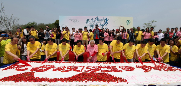 随着老书记秦华礼打响校园跑的发令枪,校园跑选手呐喊着、奔跑着,欢声笑语响彻春天的校园。全体校领导也参加了校园跑,并在随后的颁奖典礼上为精英跑全体参赛者、校园跑参赛代表、线上跑获得全部40枚电子奖牌代表颁奖。现场还制作了由校友捐赠的宽1.9米长4.2米厚75毫米的巨型生日蛋糕,寓意南邮从1942年诞生至今,已经走过75周年的光荣历程。蛋糕上鲜红的草莓摆出了“祝母校75岁生日快乐”的字样。