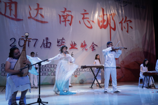 开场舞——《时间的流逝》以极具节奏感的背景音乐、动感的舞姿,拉开了晚会的帷幕。《重返十七岁》、《那些你很冒险的梦》唱出了通达学子那些年的懵懂和对未来的向往。小品《彼得小镇》、歌曲《光辉岁月》等将晚会逐渐推向高潮。器乐演奏《十里桃花终别君》以及小品《再回首,恍然如梦》则让毕业生们回顾了他们的青葱岁月。2017届毕业班辅导员上台致辞并为毕业生们献上了《祝福》。晚会在大合唱《让我留在你身边》中缓缓落下帷幕。