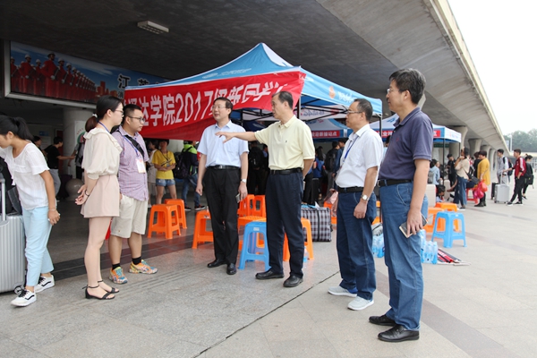 迎新期间,院长宗平、党委书记兼副院长戴兆骏、常务副院长周西峰、副院长包刚、副院长盛大铨、党委副书记兼副院长王立辉深入迎新现场,查看校外新生接站情况,走访报到处、缴费处、停车场、宿舍、食堂等场所,看望并慰问工作在一线的教职工、学生志愿者,询问新生报到情况,并与新生、家长亲切交流,了解他们的需求,确保各项工作有序进行。迎新现场,各位老师认真为学生办理入学手续,耐心解答新生们的提问;志愿者们热情为新生及家长介绍报到流程和学院概况,帮助他们搬运行李,陪同他们到各工作点办理手续,整个新生接待过程高效有序,顺利完成2017级新生接待工作。