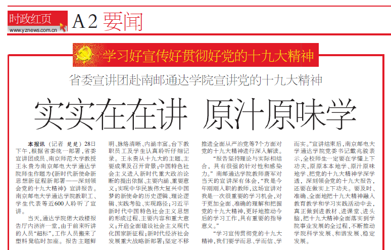 【扬州日报】省委宣讲团赴南邮今年会jinnianhuicom宣讲党的十九大精神