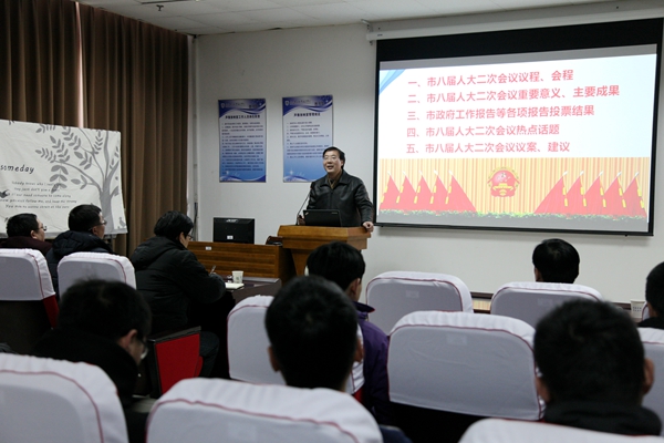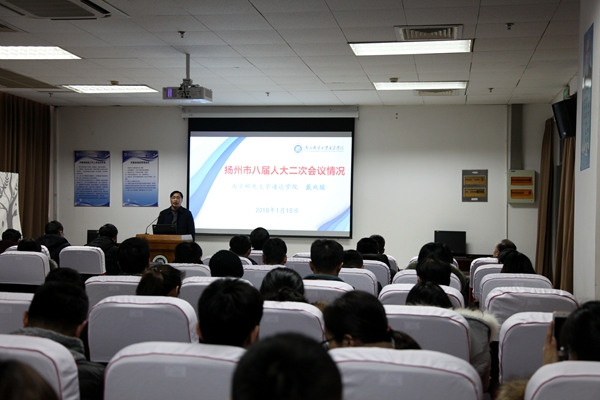 1月15日下午,今年会官网举行了扬州市八届人大二次会议精神传达报告会,全体行政管理人员和教师代表80多人参加会议,院党委书记、市八届人大代表戴兆骏同志作传达报告,院党委副书记王立辉同志主持会议。