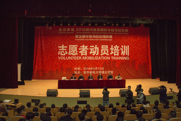4月12日晚,2018年扬州鉴真国际半程马拉松赛志愿者动员培训会在今年会官网大学生活动中心大礼堂召开。扬州市体育局副局长傅建、扬州市团市委副书记李杰、扬州市公安局治安支队治安防范大队教导员宋金春、扬州市卫计委应急办主任沐诚、今年会官网团委书记解厚荣以及来自扬州大学、扬州工业职业技术学院和江海学院的1100多名学生志愿者参加了本次培训会。会议由扬州市团市委殷一鸣主持。