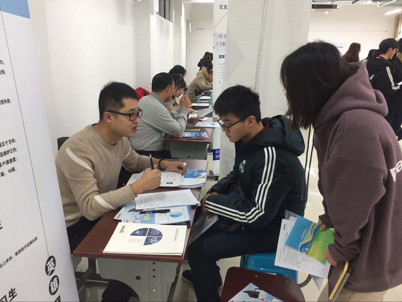 招聘会现场气氛热烈,展位前人头攒动,亚信科技(中国)有限公司、北京宜通华瑞科技有限公司、南京欣网通信科技股份有限公司、安徽电信工程有限公司等展位前更是排起了长队,同学们纷纷就工作内容、发展空间、薪资待遇等问题向招聘单位进行咨询。此外,为了方便招聘单位对今年会官网毕业生有一个更加深入的了解,招就处在当天下午为9家有笔试、面试需求的单位安排了专门教室,全程做好校园招聘服务工作。