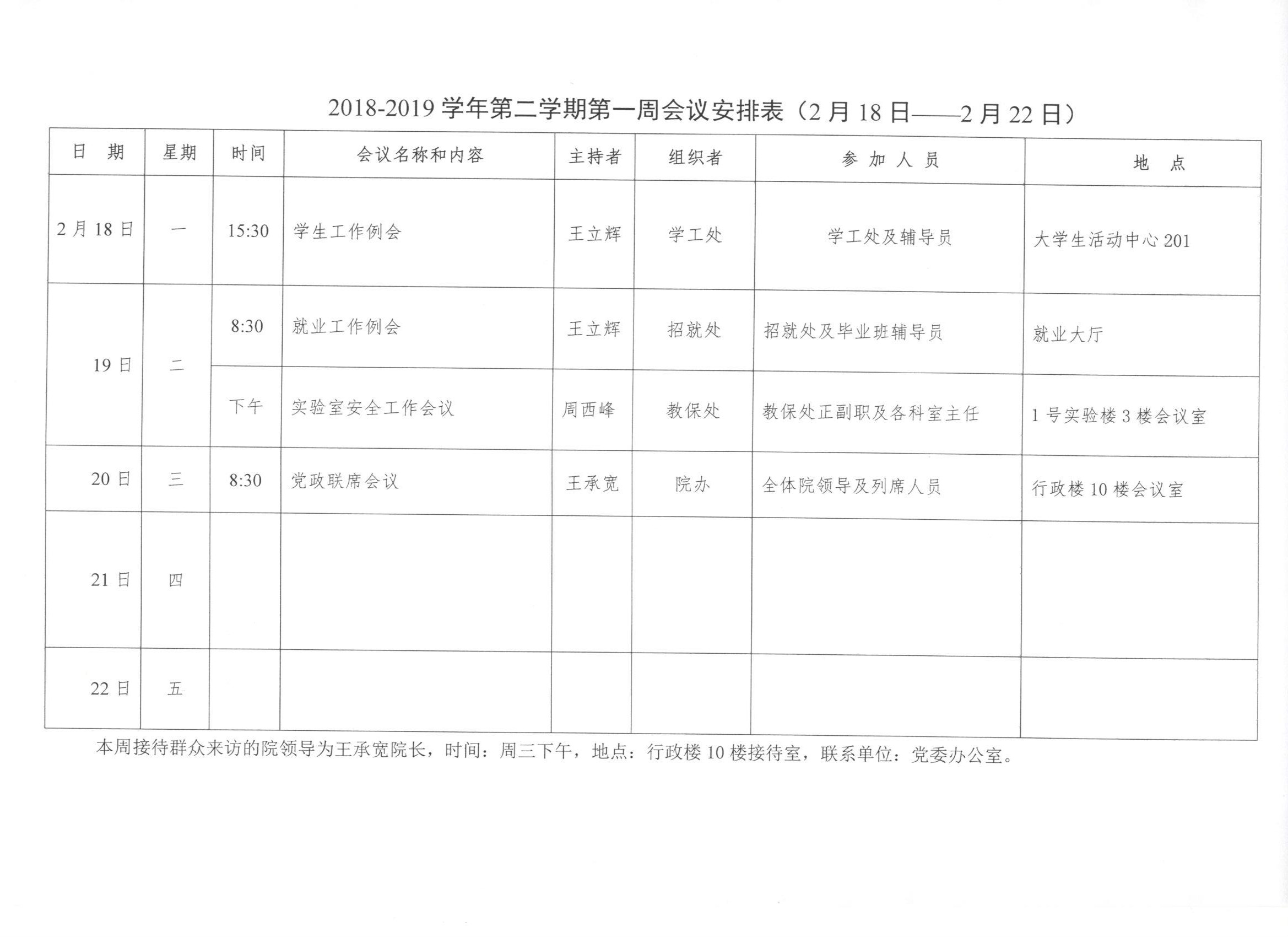 2018-2019学年第二学期第一周会议安排表