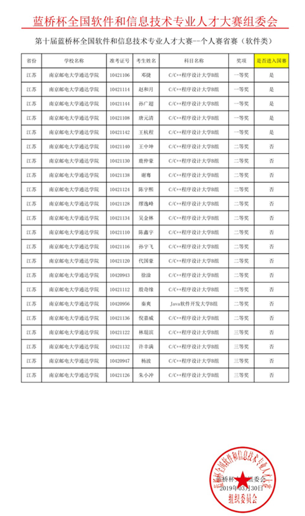 3月24日,由教育部高等学校计算机科学与技术教学指导委员会、工业和信息化部人才交流中心主办的第十届“蓝桥杯”软件类省赛成功举办。今年会官网学生取得优异成绩,在软件类C/C++程序设计大学B组获得一等奖5项、二等奖13项、三等奖4项。其中,邓捷、赵和月、孙广超、唐元清、王杭程五名同学获得一等奖,并将于5月25日参加在北京举办的“蓝桥杯“全国总决赛。