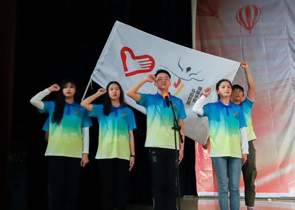 会上,院团委副书记姚远致欢迎辞,她希望同学们用自己的实际行动诠释青年的正能量,圆满完成此次志愿服务任务。随后,扬州团市委副书记李伟向志愿者代表授旗,全体志愿者进行集体宣誓;扬州市体育竞赛管理中心副主任宋捷介绍了2019年的赛事筹备情况;扬州市公安局治安支队治安防范大队教导员宋金春为同学们讲解了突发事件应急处理的办法;扬州市卫健委应急办主任陈长讲解了赛事急救站点布置及常规性运动员损伤处理方法;扬州中瑞酒店职业学院团委书记周洁带着两名志愿者代表进行示范,讲解了志愿服务礼仪细节等;两名曾参加过扬马志愿服务的学生代表,向志愿者们分享了他们的志愿服务经历。