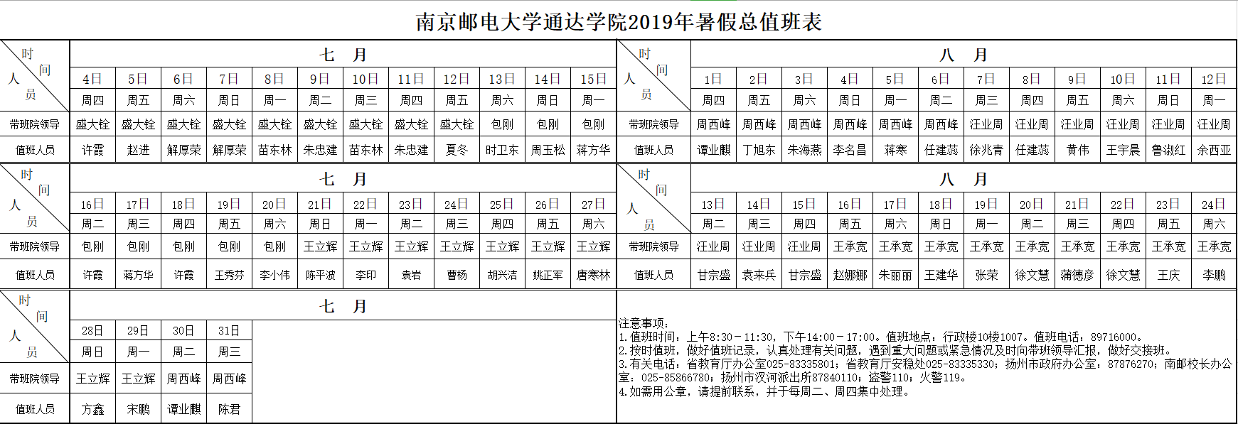 今年会官方网站2019年暑假总值班表