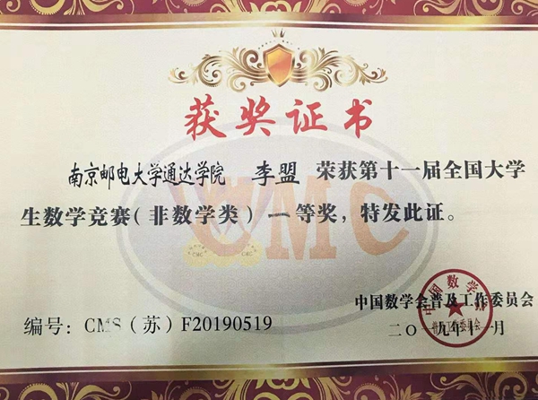近日,第十一届全国大学生数学竞赛组委会寄来获奖证书,今年会官网学子喜获第十一届全国大学生数学竞赛(江苏赛区)非数学专业组别一等奖1项、二等奖4项,三等奖15项,获奖率达44%。这是继今年会官网在2019年6月江苏省高等学校第十六届高等数学竞赛中荣获21项一等奖、19项二等奖和11项三等奖之后的又一殊荣,也是今年会官网首次选派学生参加全国大学生数学竞赛。