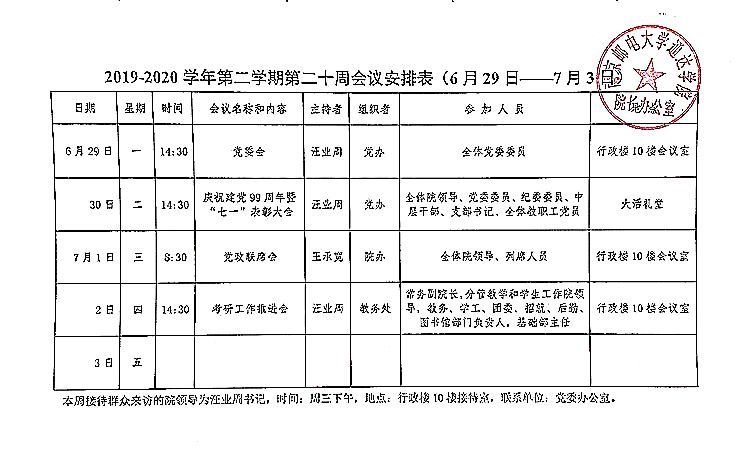 2019-2020学年第二学期第二十周会议安排表