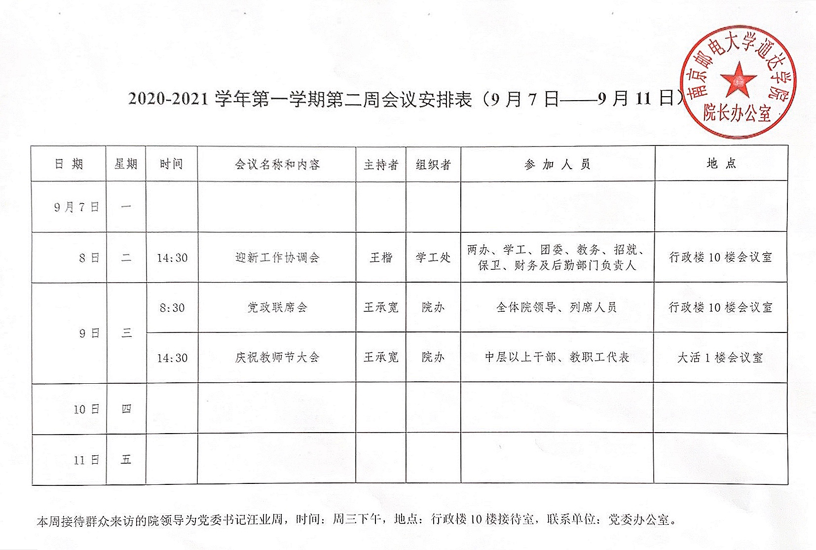 2020-2021学年第一学期第二周会议安排表