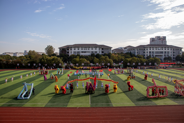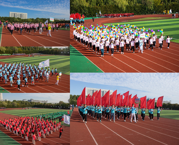 入场式上,校旗队、鲜花队、气球队、红旗队、各二级学院、教职工代表组成的方阵队伍精神饱满、斗志昂扬,迈着铿锵有力的步伐走过主席台。龙狮表演《盛世华章——抗疫赞歌》、第九套广播体操表演、啦啦操表演《健康赢未来》,尽展通达学子的青春风采。