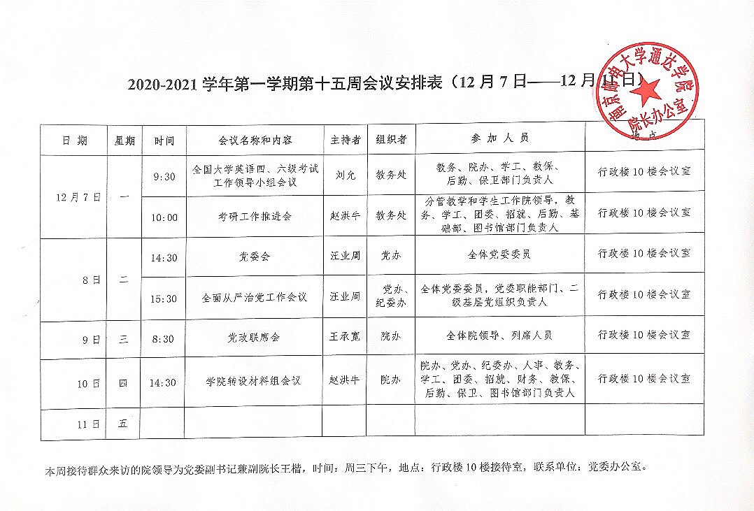 2020-2021学年第一学期第十五周会议安排表