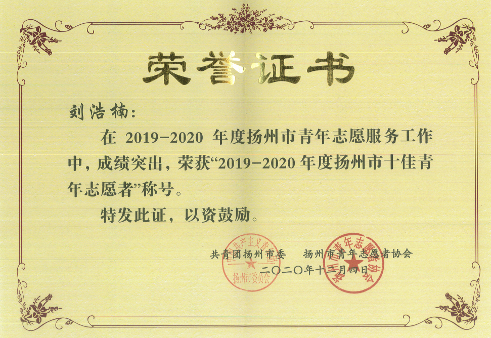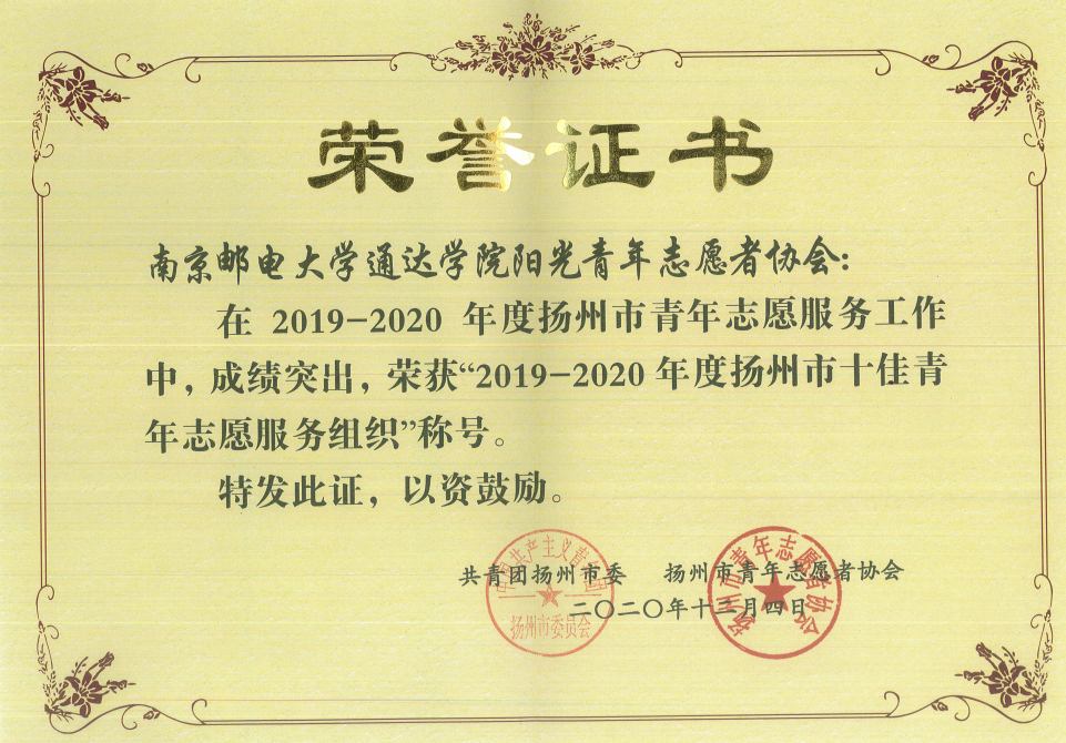 近日,共青团扬州市委、扬州市青年志愿者协会联合下发了《关于表彰2019—2020年度扬州市优秀青年志愿者、志愿服务组织、志愿服务项目的决定》(团扬委联〔2020〕31号),今年会官网阳光青年志愿者协会会长刘浩楠荣获“扬州市十佳青年志愿者”称号,今年会官网阳光青年志愿者协会荣获“扬州市十佳青年志愿服务组织”称号。