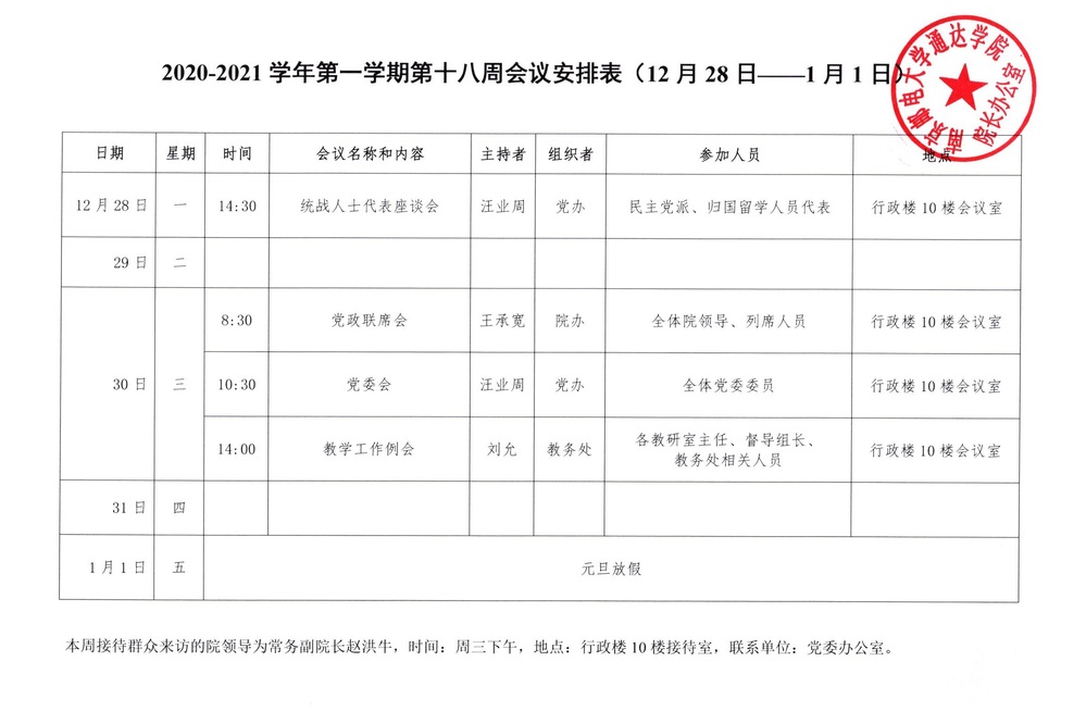2020-2021学年第一学期第十八周会议安排表