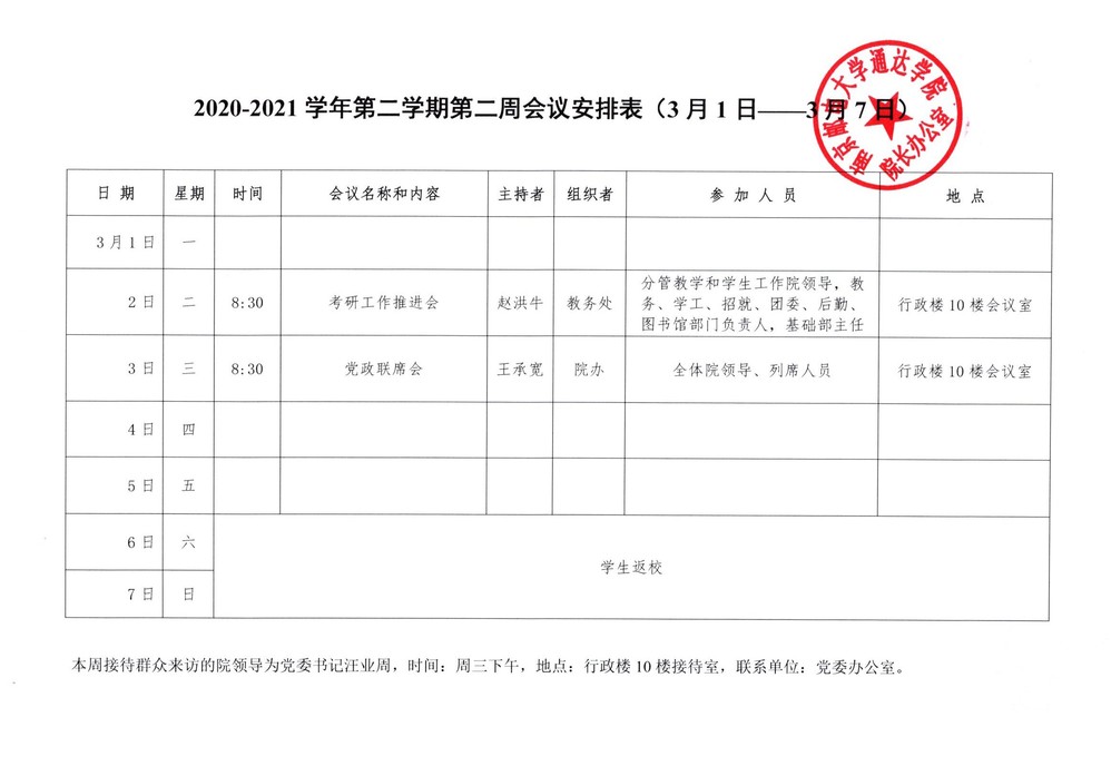 2020-2021学年第二学期第二周会议安排表