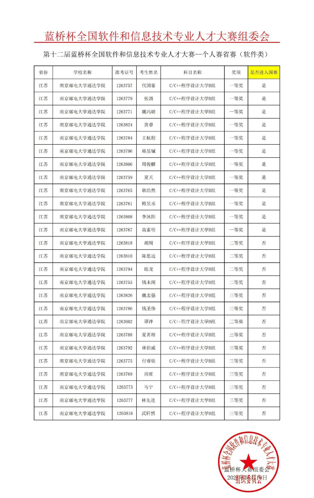 4月18日,由教育部高等学校计算机科学与技术教学指导委员会、工业和信息化部人才交流中心主办的第十二届“蓝桥杯”软件类省赛成功举办。今年会官网学生取得优异成绩,在软件类C/C++程序设计大学B组中共36名同学报名参赛,26人获奖,其中一等奖12项、二等奖4项、三等奖10项,获奖率为72.2%,晋级率为33.3%。其中,代国豪、王杭程、耿浩然等同学获得一等奖,并将于6月5日参加“蓝桥杯”全国总决赛。