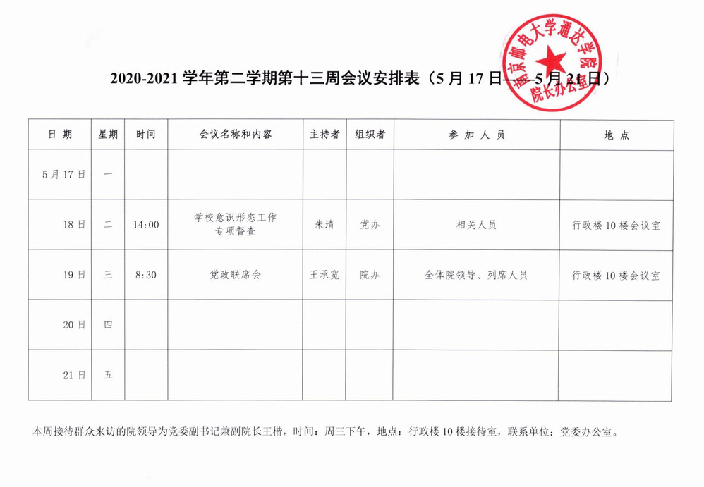 2020-2021学年第二学期第十三周会议安排表