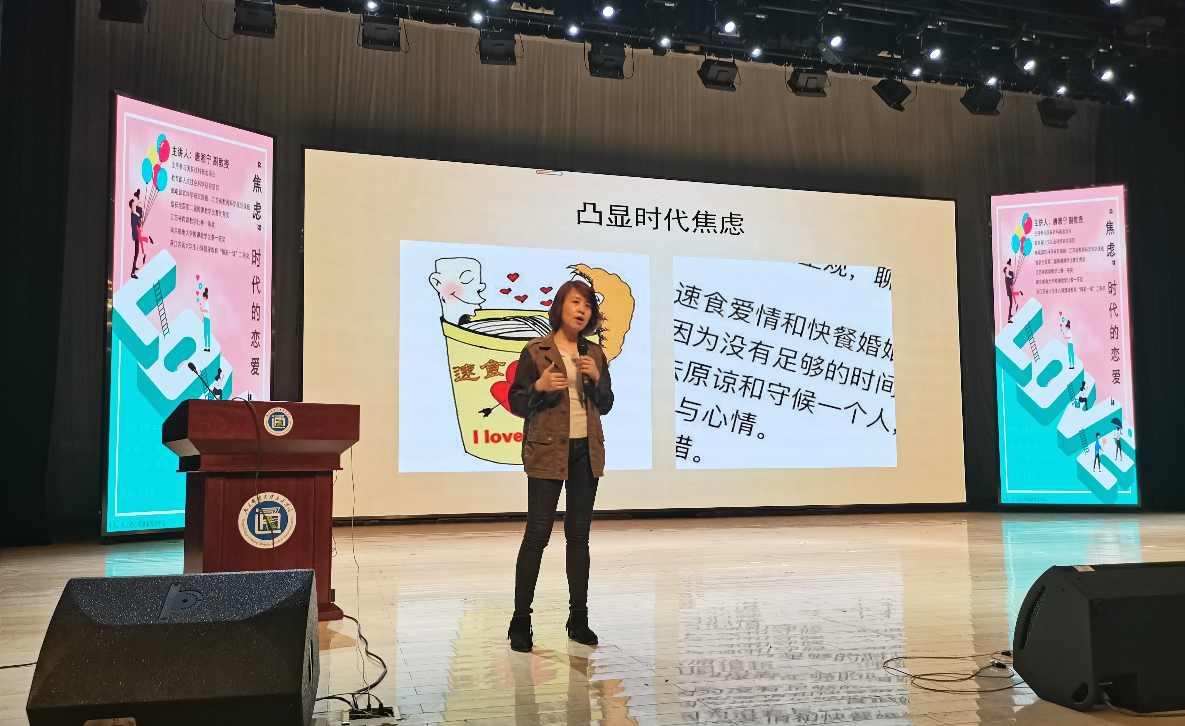 讲座中,唐老师以“焦虑”时代的恋爱为题,从微博情感热点话题和影视剧情感情节为切入点,分析引发“焦虑”恋爱观的主要原因。针对目前“焦虑”的恋爱观,唐教授鼓励同学们要积极追求健康长效的成长型恋爱,用稳定的情绪、智慧的头脑、乐观的心态来应变情感问题。