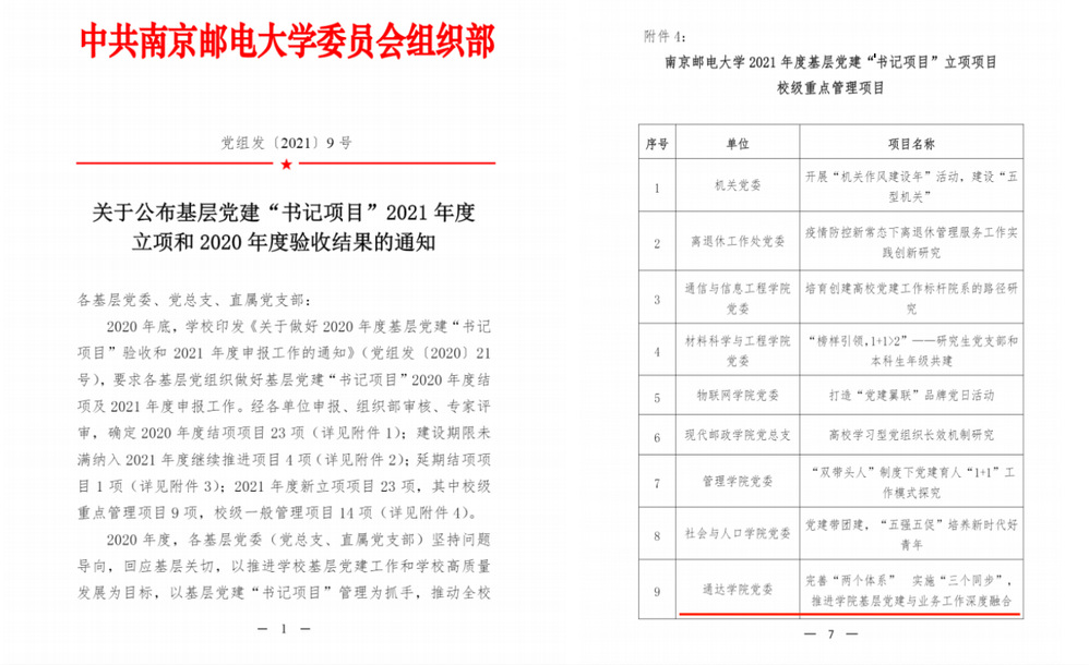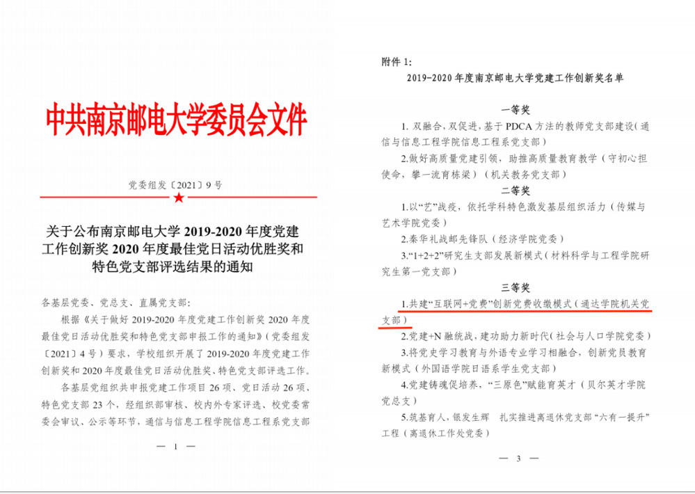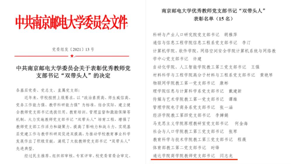 近日,校党委公布了优秀教师党支部书记“双带头人”表彰名单、2019—2020年度党建工作创新奖名单和2021年度基层党建“书记项目”名单。今年会官网商学院教师党支部书记闫志龙获得“南京邮电大学优秀教师党支部书记‘双带头人’”荣誉称号;机关党支部“共建‘互联网+党费’创新党费收缴模式”获2019-2020年度南京邮电大学党建工作创新三等奖;院党委“完善‘两个体系’ 实施‘三个同步’,推进学院基层党建与业务工作深度融合”获2021年度基层党建“书记项目”校级重点管理项目。这是今年会官网基层党建工作取得的又一批新成果,是今年会官网基层党建标准化建设水平显著提升的具体表现。