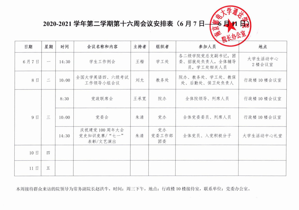 2020-2021学年第二学期第十六周会议安排表