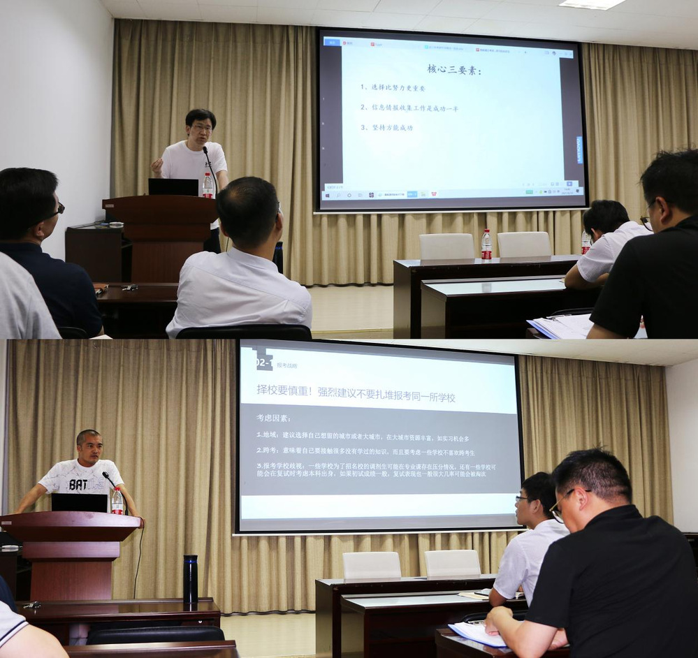 会上,教务处处长王志锋首先介绍了学院考研导师的相关政策,解读了考研导师的选拔条件、工作职责,明确了相关工作要求。随后,由往届考研导师唐军和苗东林分别分享了自己的指导学生经验。唐军老师重点介绍了考研目标院校的选择、专业定位,以及如何分配好时间做好考研准备等。苗东林老师则从“考研是什么”“为什么考研”及“怎么考研”作了分享。