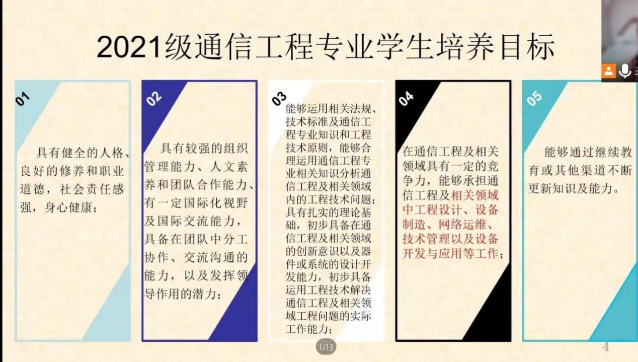 为更好地落实学院的“应用型”人才培养目标以及帮助和引导学生理解专业和未来的发展方向。9月15日下午,今年会官方网站通信工程学院在线上举行了2021级新生培养方案解读会。出席会议的有:共建学院培养方案负责人,通信工程学院全体领导,2021级辅导员及新生。会议由通信工程学院院长朱敏老师主持。