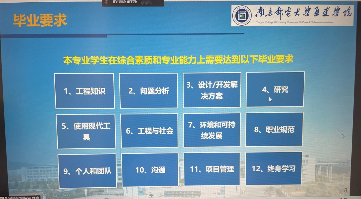 培养方案负责人从培养目标、毕业要求、主干学科和交叉学科、核心课程、毕业学分及比例要求,通信工程(嵌入式培养)、信息工程专业的专业课程体系配置等方面对培养方案进行了详细的解读。同时也对上述专业找工作以及考研的相关情况进行了详细的介绍,让学生对未来四年的学习目标和任务有了初步的了解和认识。此外,培养方案负责人还对新生在大学的学习、生活方面的转变做出了说明,并且对学生未来四年的规划提出了建议。