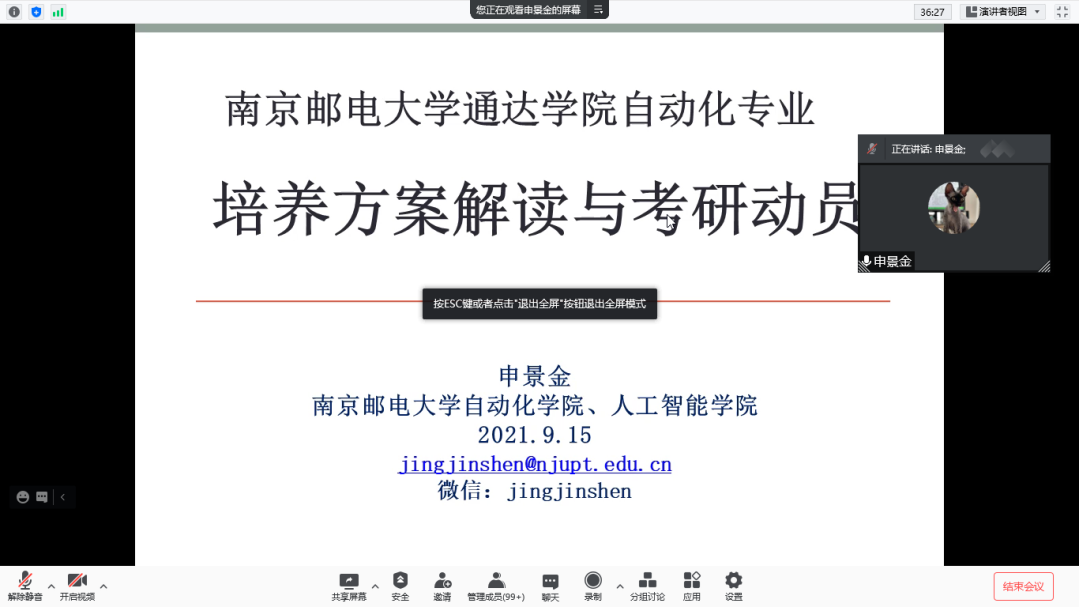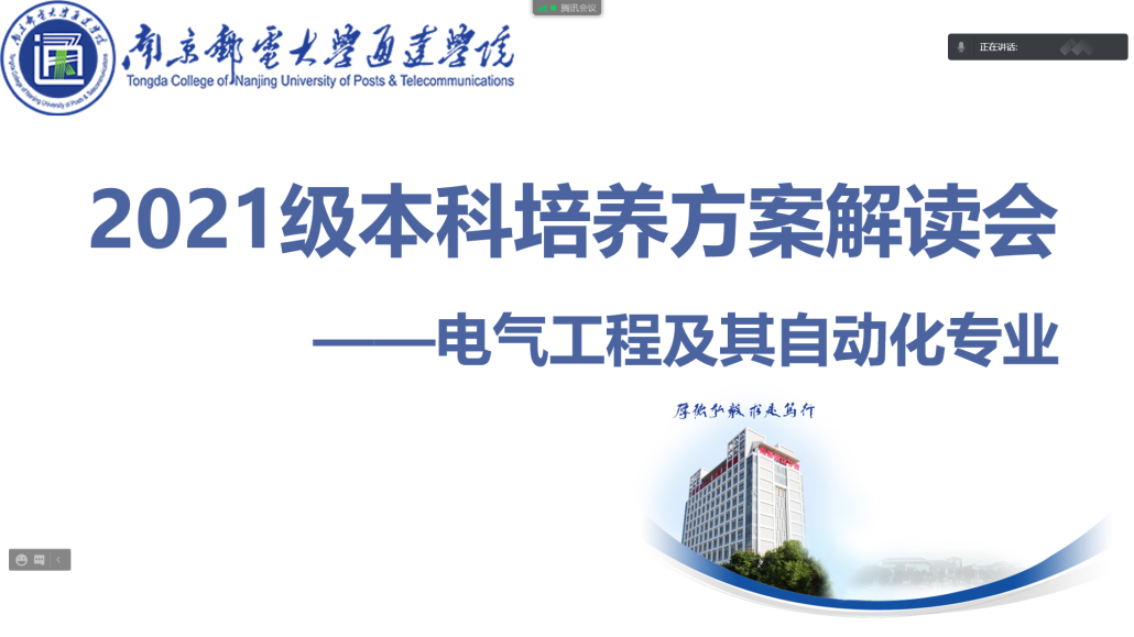 2021年9月15日下午14:00-17:00,电气工程学院线上举行了电气工程及其自动化专业和自动化专业的“2021级本科培养方案解读会”,本次解读会由电气工程学院副院长蔡晓敏老师主持,会议邀请了南京邮电大学电气系副主任巩飞老师和自动化系副主任申景金副教授对培养方案进行深入解读。