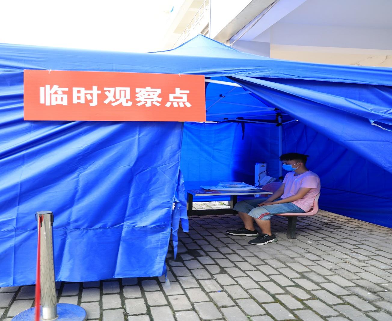 下午330,疫情防控应急演练正式开始。演练根据疫情防控期间可能会出现的情况设置了场景:学生返校后,卫生所发现一名发热学生来自于中风险地区。随即,卫生所医生将该学生就近安置在临时隔离点,立即向学院疫情防控领导小组汇报,同时向邗江区卫健委报告,指导学生穿好防护服后由转运车送至指定医院。
