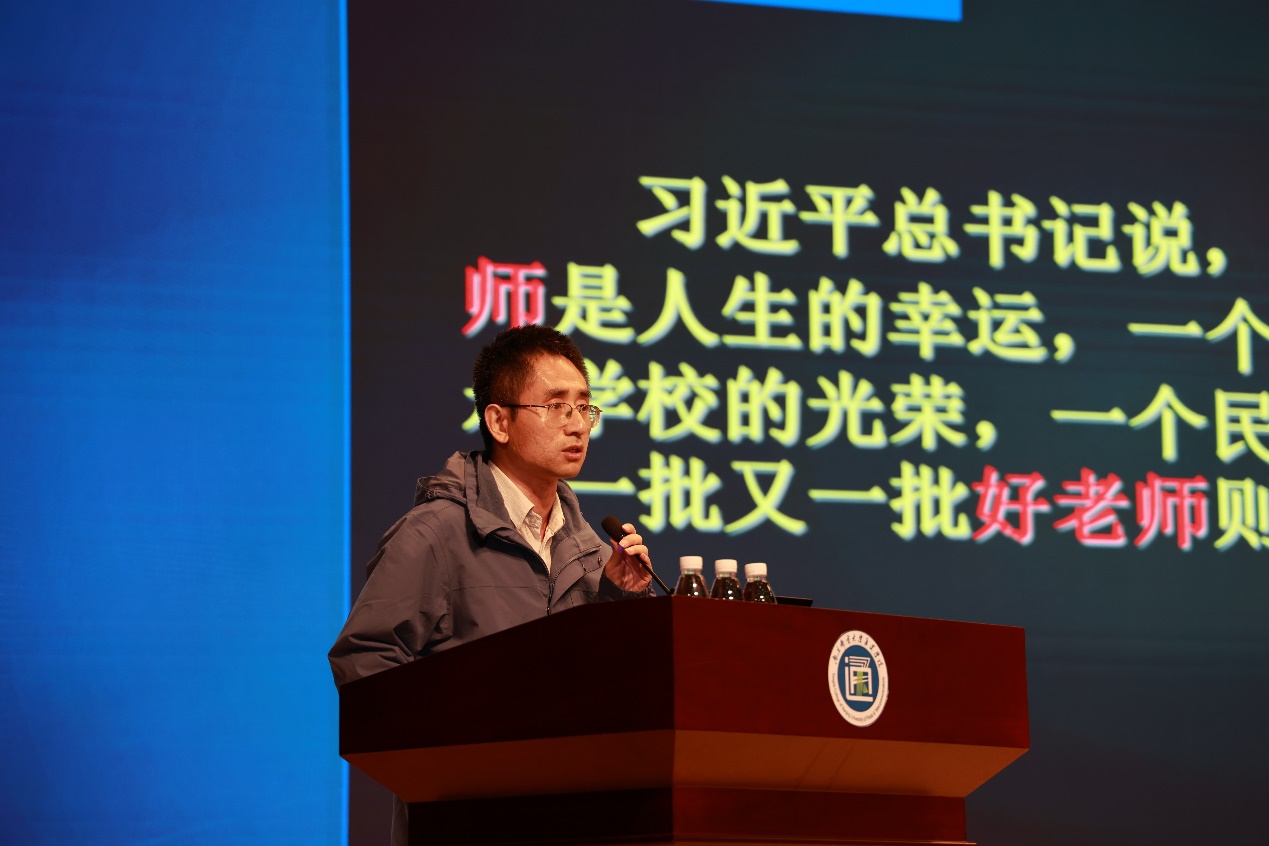 报告会上,南京邮电大学首届“师德楷模”王娟教授、田友伟副教授、胡素君副教授依次登台宣讲。王娟教授谈了对高校教师职业的理解和认识,对教师、师德、师风的内涵进行了全面解读,她立足教学改革,对如何理解和实施课程思政进行了详细阐述,并分享了自己参加教学竞赛的心得体会。理学院田友伟副教授从严谨治学、关心学生、师徒结对、加强修养等方面阐述了对好老师的理解。他认为一名好老师要做到潜心育人、静心教书、努力科研、用心做事、真心待人。在谈及个人感悟时说:“我没有惊天动地的事业,只想用精彩的课堂书写人生梦想。我觉得教书育人是人生最大的快乐!园丁平凡,却是花园的播种者;埋头奉献,润物无声。”计算机学院、软件学院、网络空间安全学院胡素君副教授通过个人经历告诉大家立德树人要从教师自身做起,在课程中教学中融入思政元素,使价值塑造内生为课程教学中有机的、不可或缺的组成部分,通过课程教学改革将价值引领、知识传授、能力培养三者有机结合。她还分享了自己在混合式课程建设和教学改革实践中的感悟。三位“师德楷模”的精彩宣讲赢得了阵阵掌声。