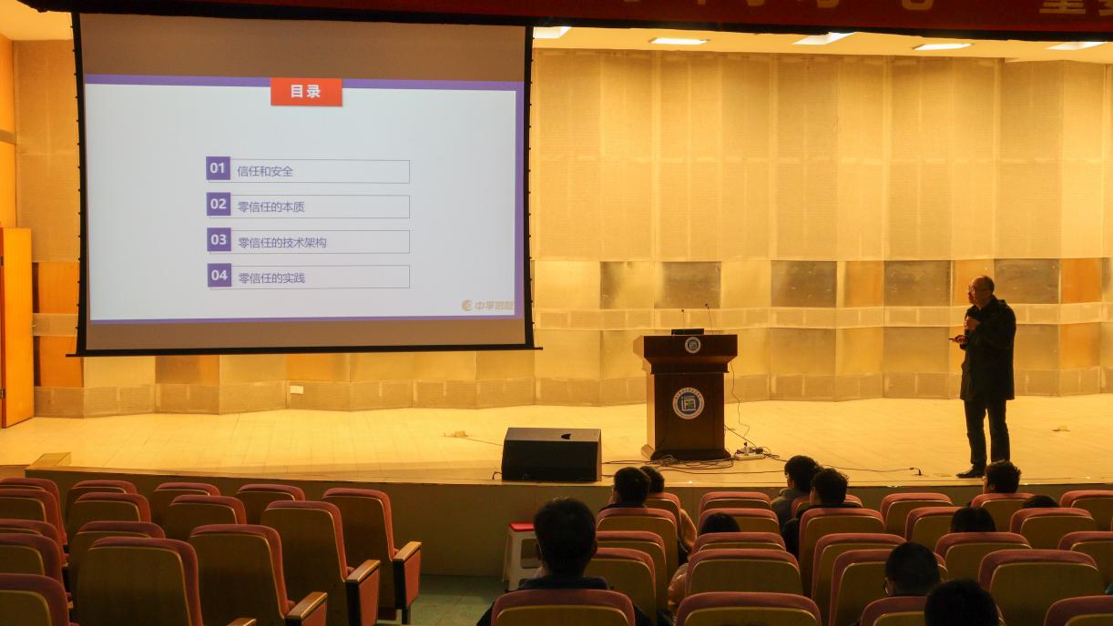 2021年12月22日下午,由今年会官方网站教务处主办,计算机工程学院承办,大学生科学与技术协会协办的以“零信任网络安全”为主题的讲座在行政楼学术报告厅举行。本次讲座邀请到了南京邮电大学陈丹伟教授担任主讲。