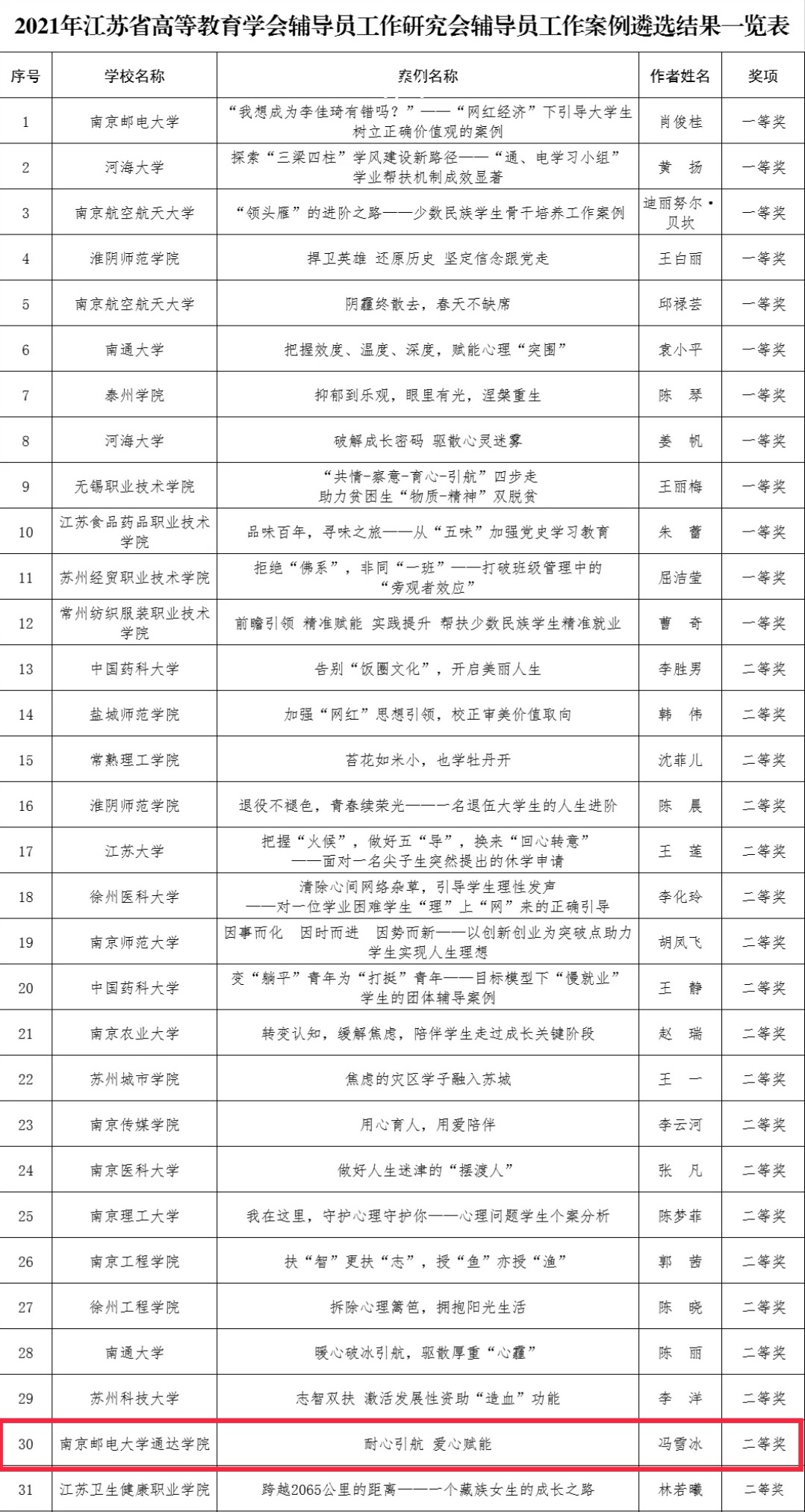 近日,江苏省高等教育学会辅导员工作研究委员会发布了《2021年江苏省高等教育学会辅导员工作研究委员会辅导员工作案例遴选结果》,今年会官网辅导员冯雪冰老师撰写的《耐心引航 爱心赋能》工作案例荣获二等奖。今年会官网是本届唯一获得二等奖的独立学院,创历史最好成绩。
