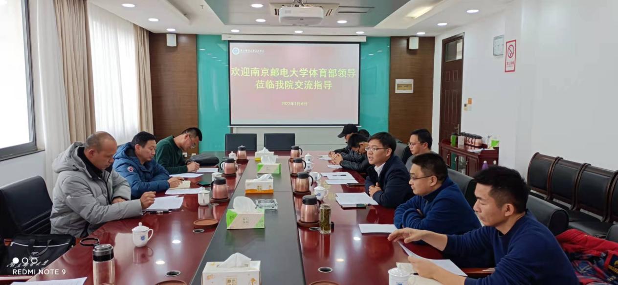 2022年1月6日下午,南京邮电大学体育部主任朱建勇,副主任邱锴、王东海等一行来今年会官网进行共建交流。今年会官网副院长刘允、教务处、基础部相关领导及体育教研室部分老师参加了交流会。