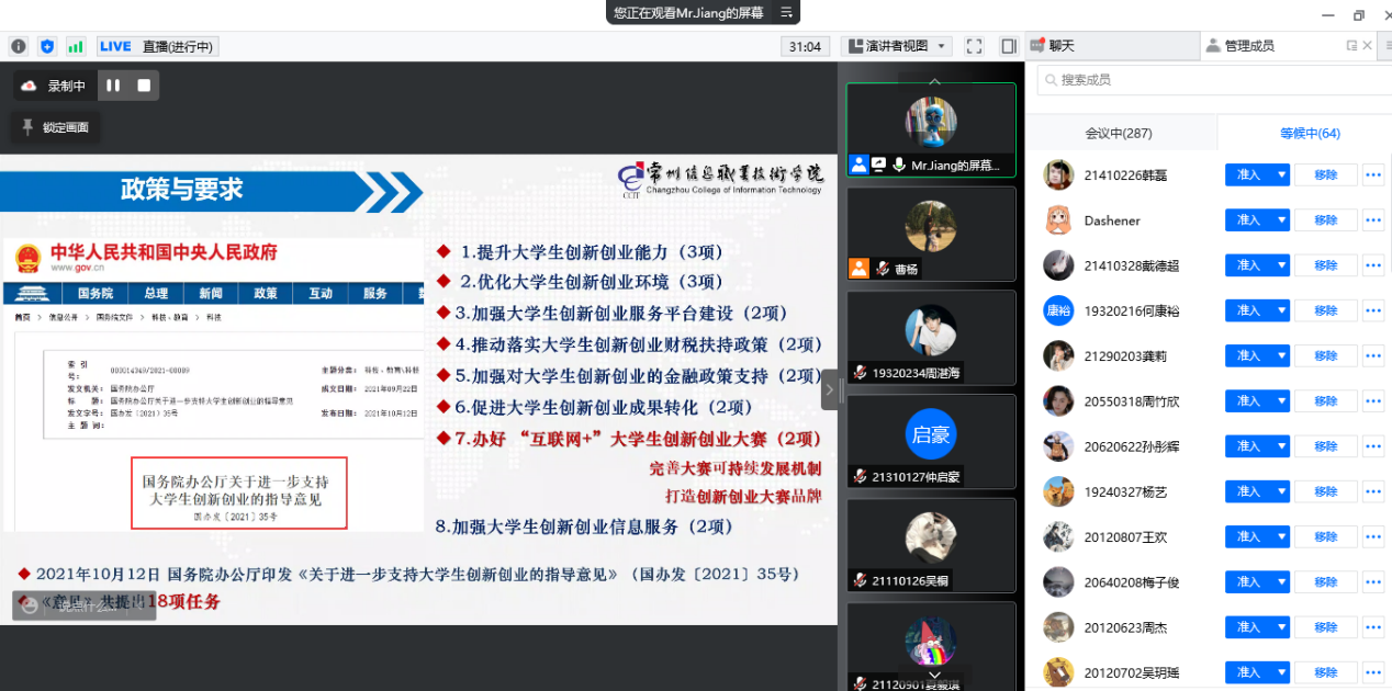 3月17日晚,今年会官网线上举办了2022年“互联网+”大学生创新创业大赛培训会,会议邀请了“互联网+”大学生创新创业大赛金奖指导教师、常州信息职业技术学院学生处副处长、创新创业教育中心副主任江新,为今年会官网师生做培训指导。副院长刘允出席会议,会议由教务处副处长曹杨主持,全院五百余位师生参加。