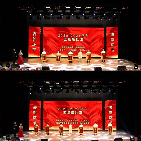 晚会期间还穿插了表彰环节,道格跆拳道社、威扬散打社、辩论队、4+1街舞社、英语协会等5个社团被评为2020-2021学年五星级社团,疾影滑板社、北极星校刊社、TNT篮球社、时光魅影摄影团、读书协会、追风足球社等6个社团被评为2020-2021学年四星级社团。